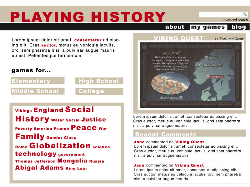 I know that's kind of the purpose of playing with language, but I think a much smaller sub-heading, directly below the title that gives the basic run-down: "your source for history-related games on the web" or whatever would keep the focus.