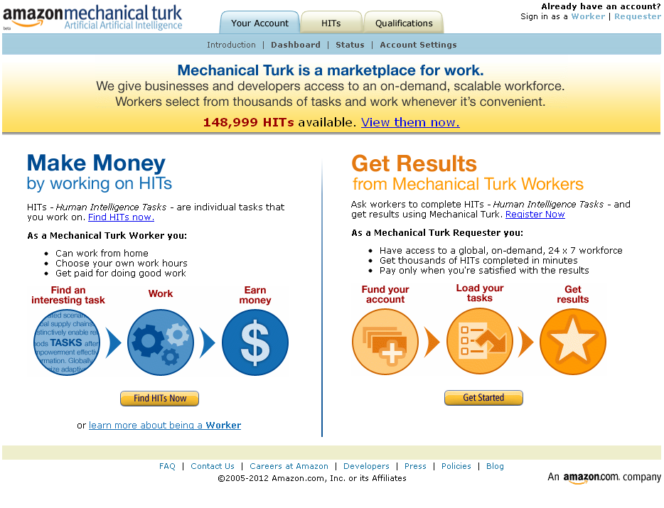 Both the image labeler and ReCaptcha are fundamentally about tapping into the capabilities of people to process information. Where I had earlier suggested that the kind of crowdsourcing I want us to be thinking about is not about labor, these kinds of human computation projects are often fundamentally about labor. This is most clearly visible in Amazon’s Mechanical Turk project.