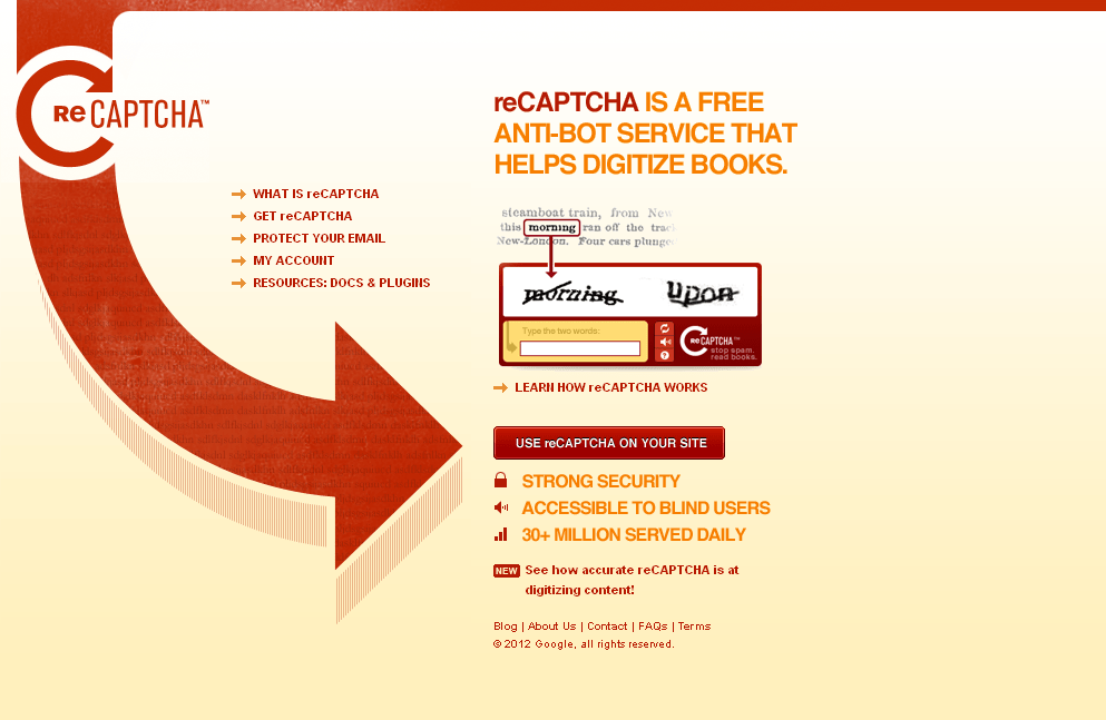 ReCaptcha is a great example of how the processing power of humans can be harnessed to improve cultural heritage collection data. Most readers will be familiar with the little ReCaptcha boxes we fill out when we need to prove that we are in fact a person and not an automated system attempting to login to some site. Our ability to read the strange and messed up text in those little boxes proves that we are people, but in the case of ReCaptcha it also helps us correct the OCR’ed text of digitized New York Times and Google Books transcripts. The same capability that allows people to be differentiated from machines is what allows us to help improve the full text search of the digitized New York Times and Google Books collections.