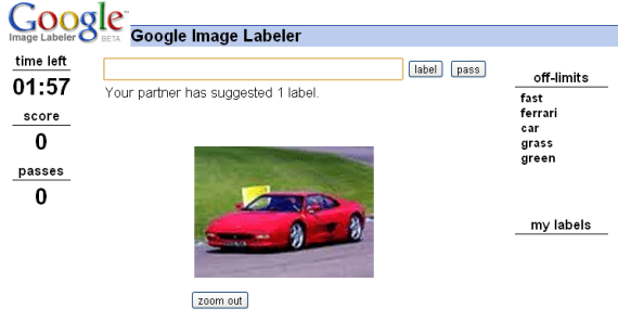 The principles of human computation are similarly on display in the Google Image Labeler. From 2006-2011 the Google image labeler game invited members of the public to describe and classify images. For example, in the image below a player is viewing an image of a red car. Somewhere else in the world another player is also viewing that image. Each player is invited to key in labels for the image, with a series of “off-limits” words which have already been associated with the image. Each label I can enter which matches a label entered by the other player results in points in the game. The game has inspired an open source version specifically designed for use at cultural heritage organizations. The design of this interaction is such that, in most cases, it results in generating high quality description of images.