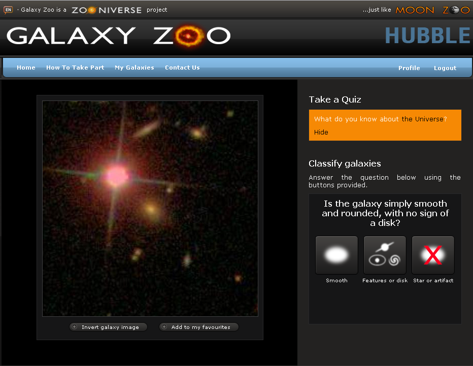 For example, Galaxy Zoo invites individuals to identify galaxies. The activity is basically the same as the Google image labeler game. Users are presented with an image of a galaxy and invited to classify it based on a simple set of taxonomic information. While the interaction is more or less the same the change in context is essential.