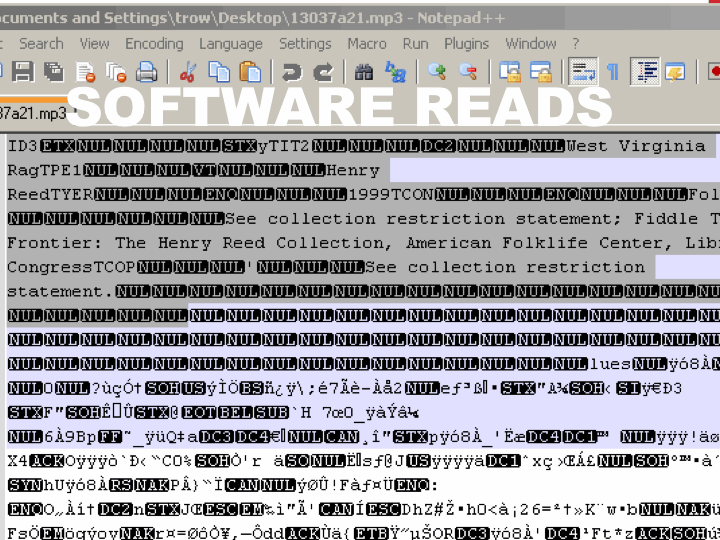 These different readings or performances of a file aren’t particularly revelatory, except to underscore that the very act of opening a file, of seeing its contents is a process of interpretation a text. The sequence of 1’s and 0’s is enacted in front of us by software. Formats and software are themselves essential actants in this performance which other humanities scholars have done great work to help us understand.