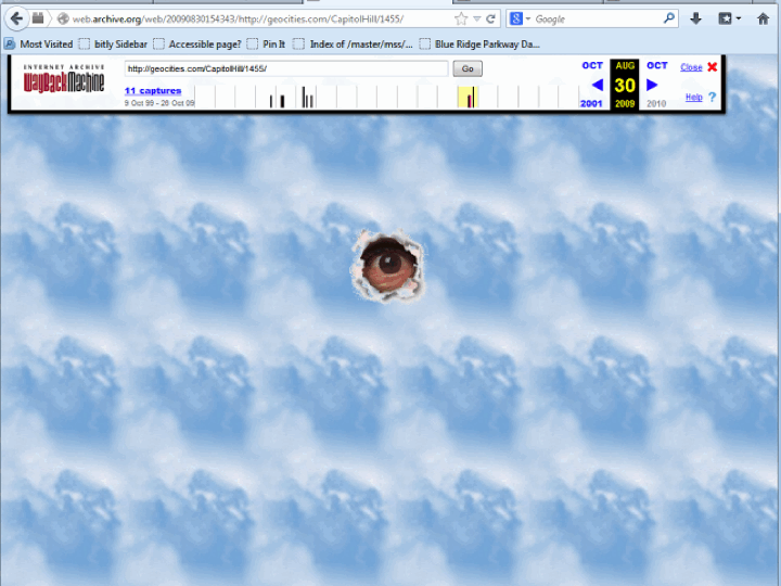 Here are two images of archived copies of a spot in the Capitol Hill neighborhood of Geocities. This first one is what it looks like rendered on my browser at work. This second one, is what it looks like as presented in One Kilobyte of the Terabyte Age. Created by Olia Lialina & Dragan Espenschied. One Terabyte of Kilobyte Age, is in effect a designed reenactment of geocities grounded in an articulated approach to accessibility and authenticity which plays out in an ongoing stream of posts to a tumblr account. Back to the two images: Note that the header image is missing in the first one, as displayed in my modern browser. The image is still there, but my browser isn’t doing a good job at creating a high fidelity presentation of what the site should look like.