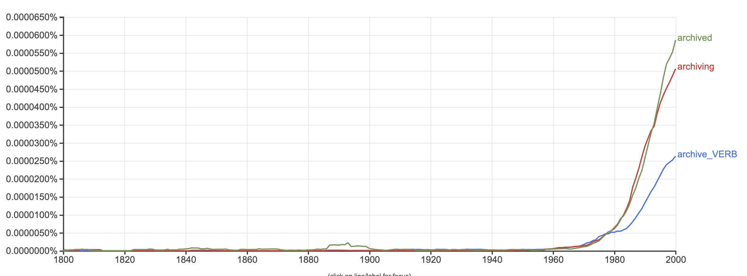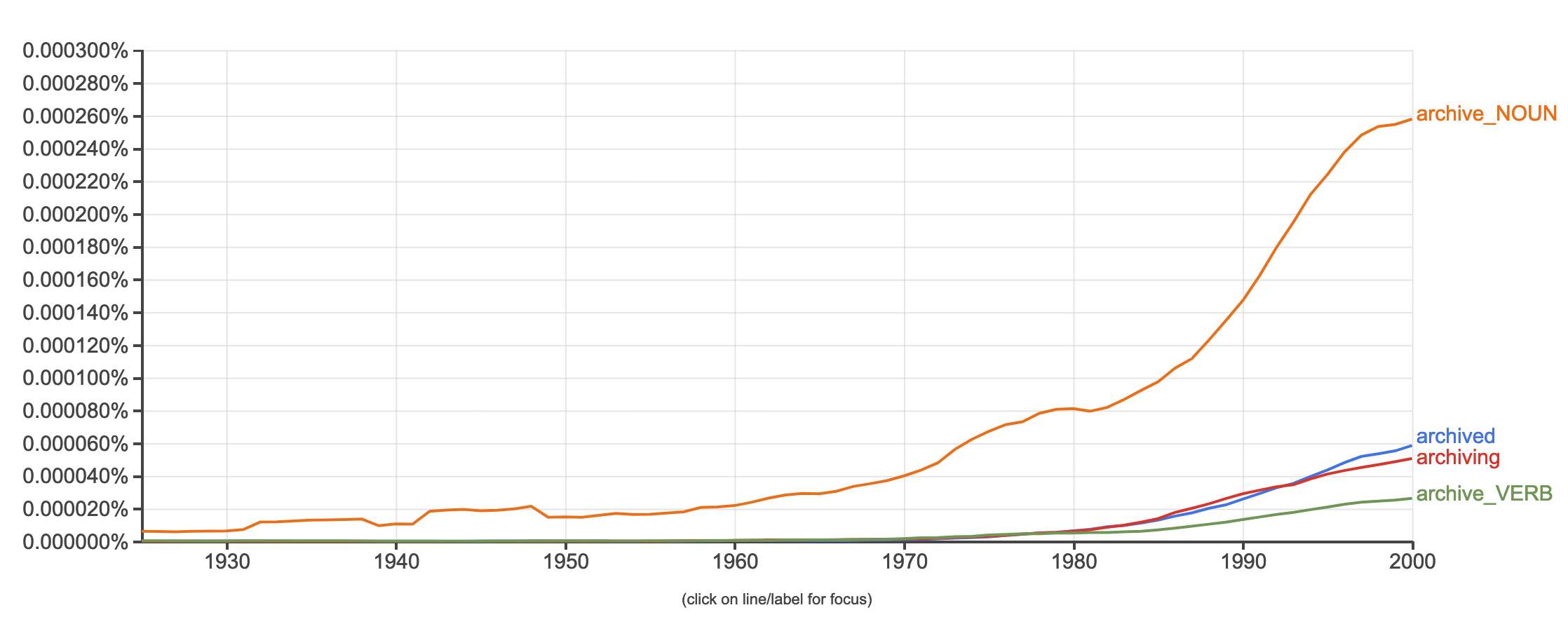 This kind of question is exactly the sort of thing that Google n-gram is useful for. Over time I’ve generated a few different graphs of trends around the verb usage of archive in Google books and posted them to twitter. It seemed like it would be worth taking a few minutes to explore that data a bit more. What follows is really just some initial notes on some searches. I’m curious to get other interpretations on what we learn from these charts and examples of usage.