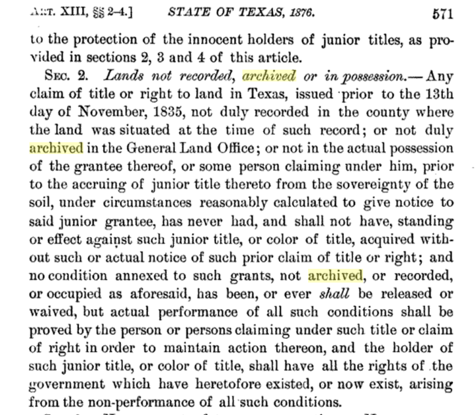 The snippet below is one of a series of documents from the turn of the 20th century in Texas that use the terms archiving and archived that appear to largely be related to usage of the term in the “Constitutions of Texas”