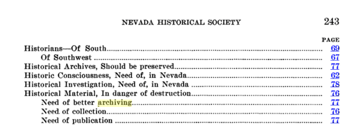There are even a few other earlier examples of “archiving” that show up, like in this 1913 report from the Nevada Historical Society reports a “need of better archiving” in a heading in the table of contents.