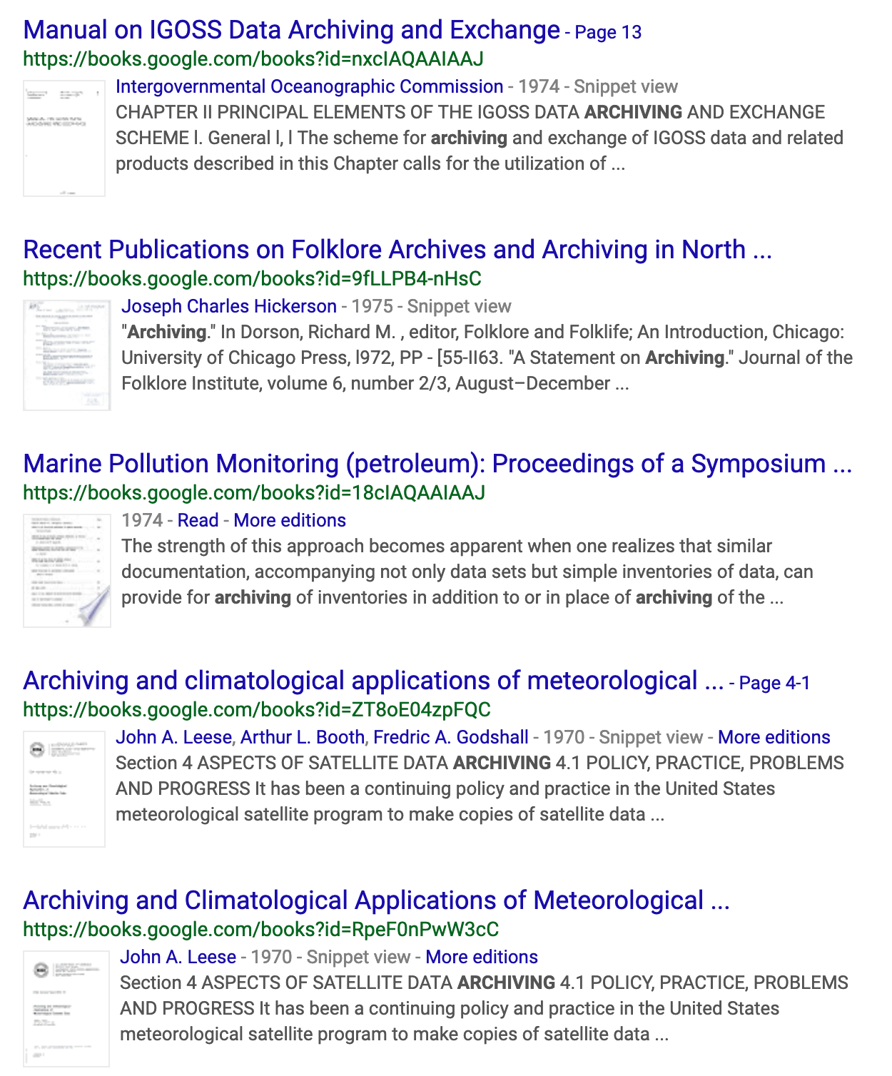 From that point out, the term archiving seems to appear primarily in relationship to computing. All of the examples of the term archiving are references to data for usage of the term in google book results from the 1970s.