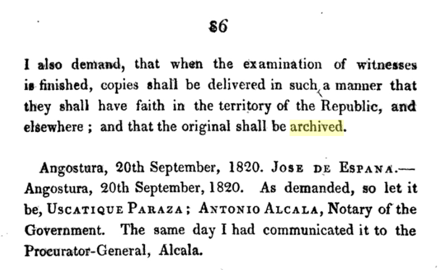 As noted in the beginning of this post, Webster’s suggests the verb form of archive came about in 1831. There are a range of examples of “archived” that show up, even earlier than 1831, for instance the example below from 1823 or this other example from 1816.