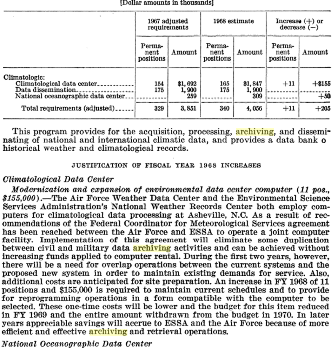 Below is an example of one of the first instances of the term “archiving” connected to the term “data” in the google books corpus. It’s from a 1968 appropriations hearing for a climatological data center. That places it right at the inflection point for the verb form usage of archive.