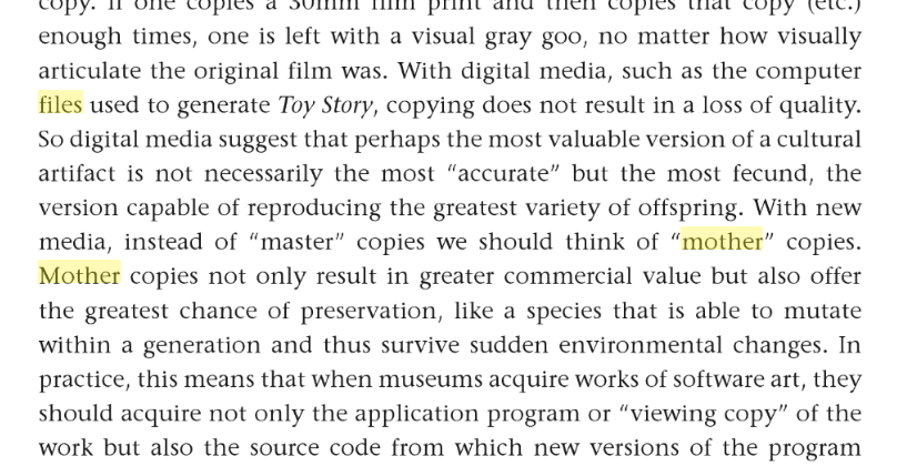 In Re-collection: Art, New Media, and Social Memory Richard Rinehart and Jon Ippolito also take a run at the idea of a canonical master file for any given work. They suggest that with digital media, in many cases instead of thinking about a master file it’s more important to be looking for what they call “mother files;” the editable files that enable a wide range of outputs. You can see more on their thinking in the pull quote from the book below.