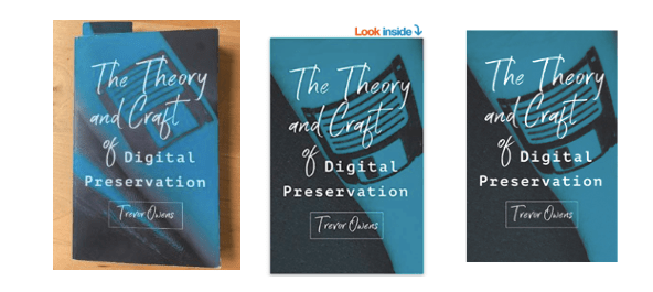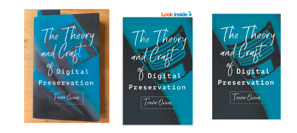 Below are three images of my book, The Theory and Craft of Digital Preservation. The first is a picture I took of a print copy of the book. The second is the book cover on Amazon. The third is from Johns Hopkins University Press page for the book.