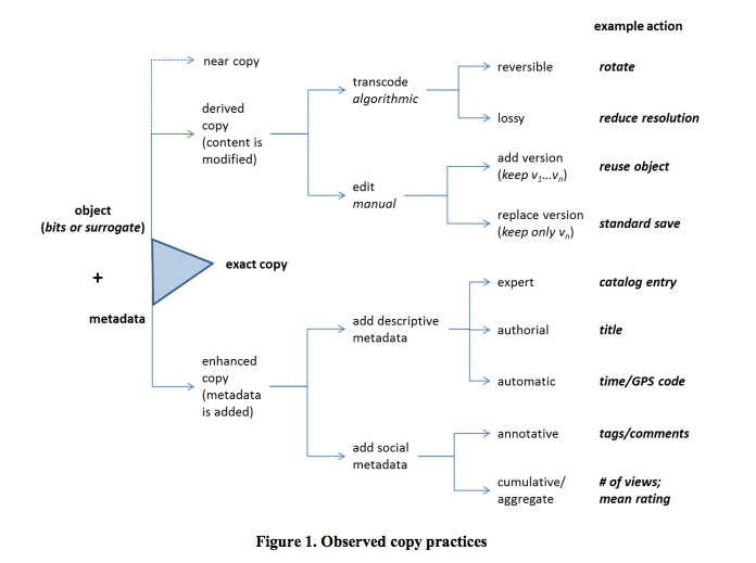 In Digital Copies and a Distributed Notion of Reference in Personal Archives Cathy Marshal explores the various kinds of copies and derivatives that people produce in managing and sharing videos and photos. Below is a map of the kinds of variances she observes.