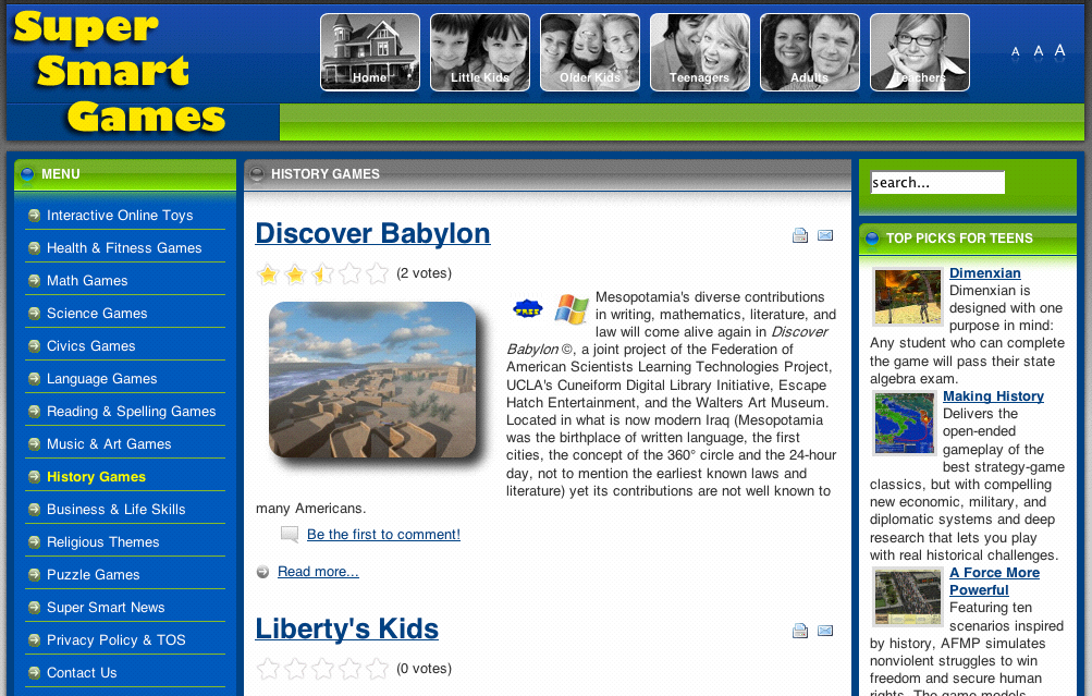 Before coming to the Center for History and New Media I worked on the planing committee for the Games Learning and Society Conference, an annual conference on the role of video games in teaching and learning. For my project I am thinking about bringing my interests in games and education together with my background in history to create a web portal for teachers looking for games to integrate into their classroom. By walking through the educational games site Super Smart Games I can unpack some of the features that I think would more effectively position a site toward integrating games in the classroom.