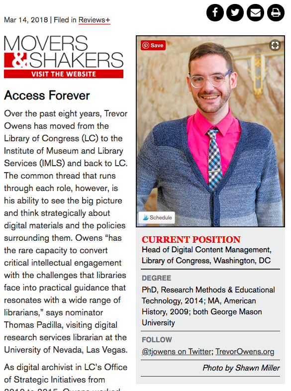 This year I’ve organized things into work managing and coaching teams at the Library of Congress, work communicating about digital preservation, and broader engagements in teaching, learning, and scholarship in digital history and digital curation.